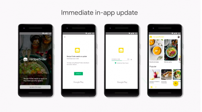 As detailed in the Android Dev Summit, The API comes in two flavors: immediate and flexible. Immediate displays a full-screen message right when a player boots up an Android app that prompts them to update the app. That update is then downloaded and installed right then and there, from within the app itself.