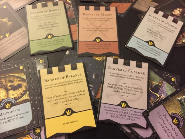 Monarch’s rules are such: As one of four princesses in a fictional kingdom, players must assemble a court worth the highest value by collecting cards and stacking their effects. Cards are purchased from the market with food or gold, which can be acquired once per turn from the land tiles by taxing or harvesting the shared land. The winner ascends to the throne.